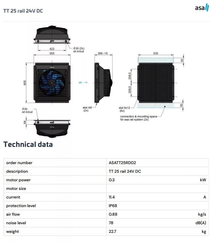 Der ASATT25RD02 ist der größte Serientyp der 24V-DC-Öl-Luft-Kühler aus der TT-Baureihe von ASA Hydraulik und repräsentiert die Spitze der gleichstrombetriebenen Modelle. Er ist ideal für leistungsstarke mobile Hydrauliksysteme, die maximale Kühlkapazität erfordern – beispielsweise bei Schwerlastmaschinen, industriellen Fahrwerken sowie Forst- und Baumaschinen. Das Preis-Leistungs-Verhältnis ist besonders bemerkenswert: Der Luftmassenstrom von 0,88 kg/s wird mit lediglich einem 0,30-kW-Motor und 11,4 A Stromaufnahme erreicht – schonend für das 24V-Bordnetz. Die große Kühlfläche, das patentierte ASA-Rail-Anschlusssystem, der gewellte Aluminiumlamellenkühler und der IP-68-geschützte Lüfter machen dieses Modell zur vielseitigsten Hochleistungswahl der TT-Baureihe.