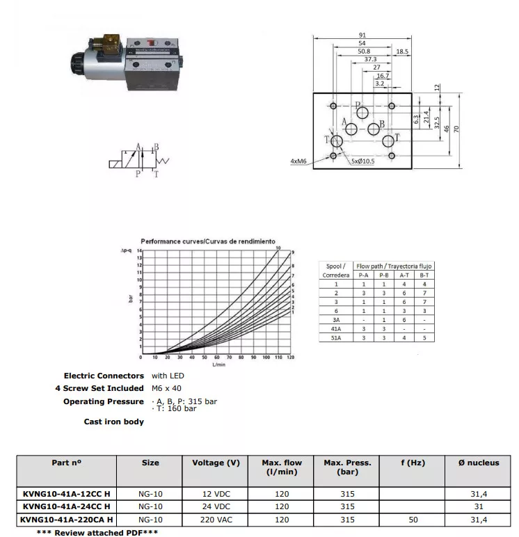 Das KVNG10-41A-12CC H ist ein hydraulisches Wegeventil der Baugröße NG10, einfachmagnetisch, mit Schieberausführung 41A, ausgelegt für industrielle und mobile Hydrauliksysteme mit höherem Durchflussbedarf. Der mit 12V DC betriebene Solenoid gewährleistet zuverlässiges Schalten; die integrierte LED-Anzeige zeigt auf einen Blick, ob das Ventil aktiv ist. Das Gusseisengehäuse bietet lange Lebensdauer und mechanische Stabilität auch unter anspruchsvollen Betriebsbedingungen. An den Anschlüssen A, B und P werden bis zu 315 bar Max. Betriebsdruck erreicht, am T-Anschluss 160 bar. Der maximale Durchfluss beträgt 120 l/min; das für die Montage benötigte Schraubenset M6×40 liegt dem Lieferumfang bei.